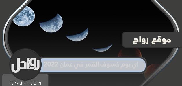 يكون خسوف القمر في سلطنة عمان مساء الثلاثاء 8 نوفمبر من عام 2022 م ، والساعات الأولى من يوم الأربعاء. كوكب الأرض ، بحسب عضو الجمعية الفلكية العمانية فيصل بن محمد القرطوبي ، الذي أكد أن خسوف شبه الظل للقمر سيحدث في تمام الساعة 10:43 مساء الثلاثاء ، بحيث يخفت سطوع القمر قليلا. دون أن ينكسر ، بشرط أن يبدأ الكسوف في الساعة 12:01 منتصف الليل. ليلًا ، وستكون الذروة في الساعة 1:30 صباحًا يوم الأربعاء ، وينتهي الكسوف الجزئي في الساعة 2:59 ، والكسوف شبه الظاهر في الساعة 4:17 صباحًا يوم الأربعاء 9 نوفمبر 2022..