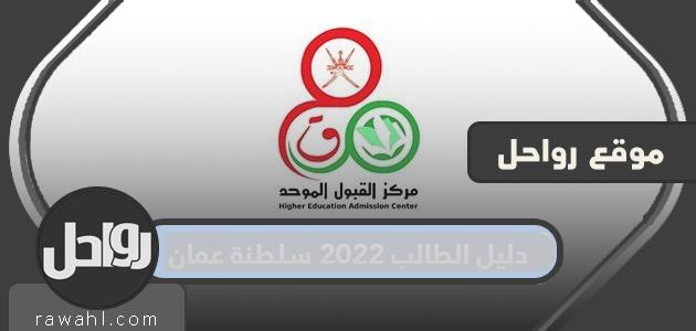 دليل الطالب في سلطنة عمان للعام الدراسي 2023/2023 هو المرجع الدليل الوحيد والحصري للقبول في مؤسسات التعليم العالي العمانية، وهو الدليل المعتمد الذي يصدره سنويا مركز القبول الموحد في سلطنة عمان لإيصال كافة المعلومات والإجراءات التي يجب على الطلبة مراعاتها عند تقديم طلبات القبول الإلكتروني في مؤسسات التعليم العالي المختلفة. ويهدف هذا الدليل إلى توضيح إجراءات التسجيل في نظام القبول الإلكتروني، وتقديم العديد من النصائح والإرشادات المتعلقة بكيفية اختيار البرامج الدراسية المراد الالتحاق بها في مؤسسات التعليم العالي الحكومية والبعثات والمنح الداخلية والخارجية بشكل صحيح. كما يعرض الدليل متطلبات كل برنامج أكاديمي للعام الدراسي 2023/2023 وشروط القبول فيه، بالإضافة إلى التعرف على مراحل التسجيل والقبول؛ بدءا من مرحلة التسجيل في نظام القبول الموحد إلى مرحلة تعديل الرغبات الدراسية.[1]