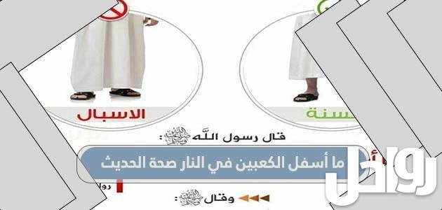 ما أسفل الكعبين في النار صحة الحديث حديث الرسول الكريم (ما تحت الكاحلين في النار) حديث صحيح مما ورد في الأحاديث النبوية الجليلة في ذلك، ومنها ما رواه أبو هريرة رضي الله عنه: قال رسول الله صلى الله عليه وسلم: “ما تحت الكاحلين في الكاحلين”..حيث أن الرسول الكريم يحذر الرجال المسلمين من أن الملابس التي تنزل من الكاحلين (العظام البارزة في مفصل القدم والساق)، فإن ذلك الرجل سيعذب بالنار، باستثناء النساء اللواتي يؤمرن بستر الجميع. أجسامهم.